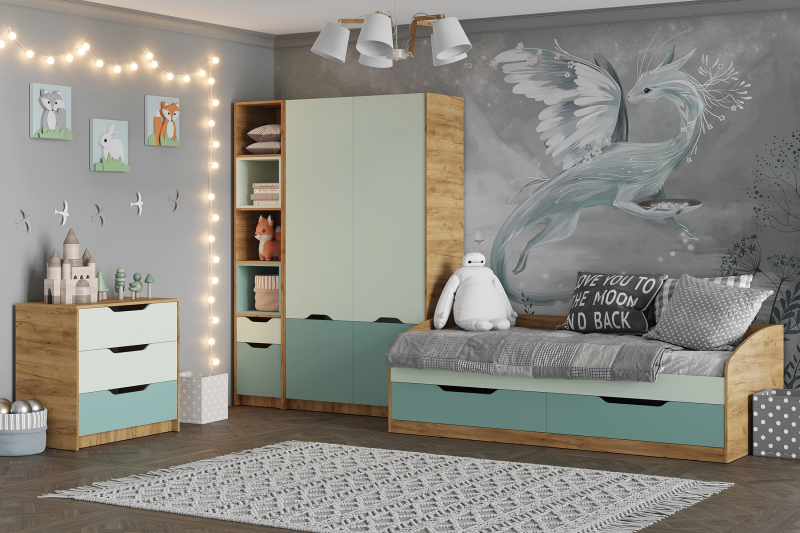 Детская комната RICH — это гармония цвета, безопасности и функциональности, созданная специально для современных интерьеров. Сочетание тёплого Дуба крафт золотого с пастельными оттенками зелёного Кенди и сумеречного голубого формирует атмосферу уюта, спокойствия и вдохновения — идеальную среду для роста и развития ребёнка.
