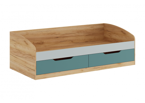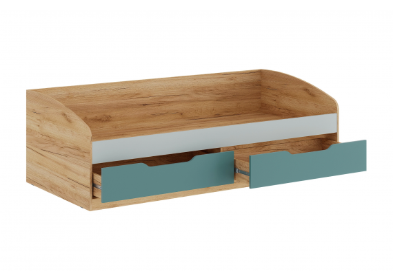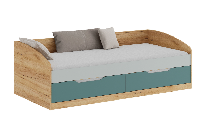Кровать-тахта RICH — это идеальное решение для современной детской комнаты. Тёплый оттенок дуб крафт золотой в сочетании с пастельными фасадами зелёного Кенди и сумеречного голубого создаёт уютную и сбалансированную атмосферу. Модель разработана с учётом безопасности, эргономики и функциональности: два вместительных бельевых ящика, фрезерованные фасады без ручек, шариковые направляющие и экологичные материалы.