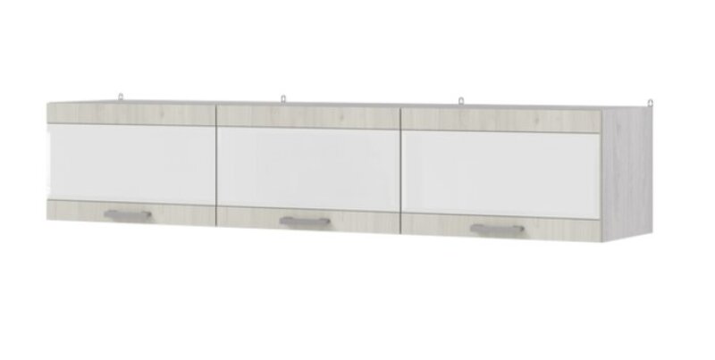 Антресоль Амелия имеет навесную конструкцию в виде закрытой настенной полки: три откидные створки поднимаются на газлифтах, образуя ниши для хранения некрупных предметов. Она отлично дополнит интерьер гостиной, спальни или прихожей, оживив интерьер, позволяя держать вещи в порядке.