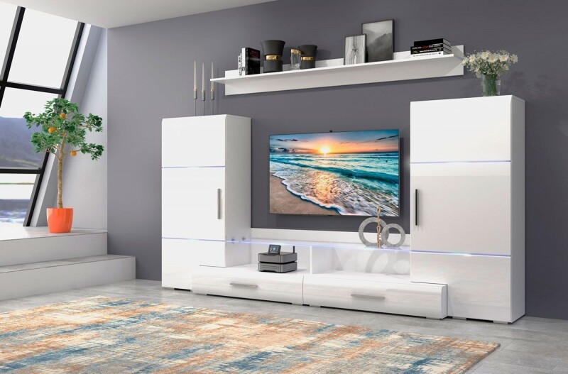 Гостиная «Домино» — это стильное решение для современного интерьера. Белый глянцевый фасад придаёт мебели лёгкость и визуальную чистоту, делая пространство светлее и просторнее. Компактная компоновка идеально подходит для небольших комнат, сохраняя при этом функциональность и эстетику.