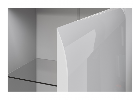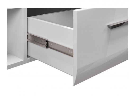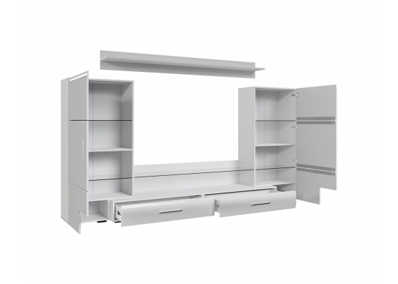 Комплект включает ТВ-тумбу с двумя выдвижными ящиками, два шкафа и навесную полку шириной 2000 мм. Все двери и ящики оснащены фурнитурой с доводчиками, обеспечивающей плавное и бесшумное закрывание. Стеклянные элементы и лаконичные линии подчёркивают современный характер модели.