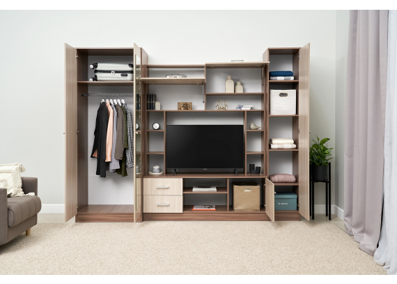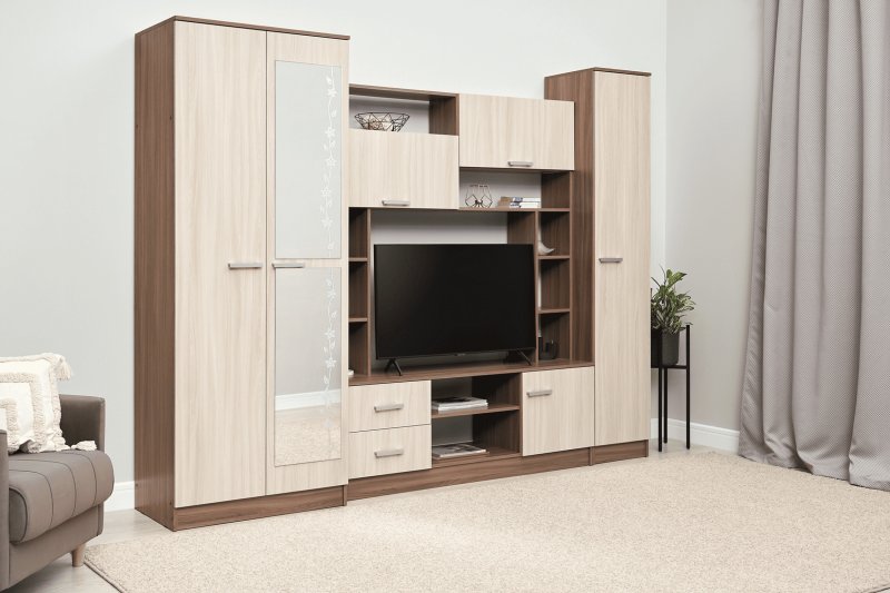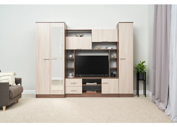 Элегантная и компактная стенка в гостиную Марта в нежном натуральном цвете Шимо выглядит современно и аккуратно. Такая стенка не станет загромождать собой пространство, отягощая интерьер, а наоборот, за счет нежной цветовой гаммы и теплых оттенков создает атмосферу легкости и уюта вокруг, ненавязчиво выполняя свои функции. Множество открытых и закрытых полок, ниши под TV-оборудование, выдвижные ящики и платяной шкаф – здесь есть все для практичной организации пространства. Дополнительным элементом, который служит не только как украшение фасада, но и несет практическую пользу, является зеркало, украшенное нежным изящным рисунком.