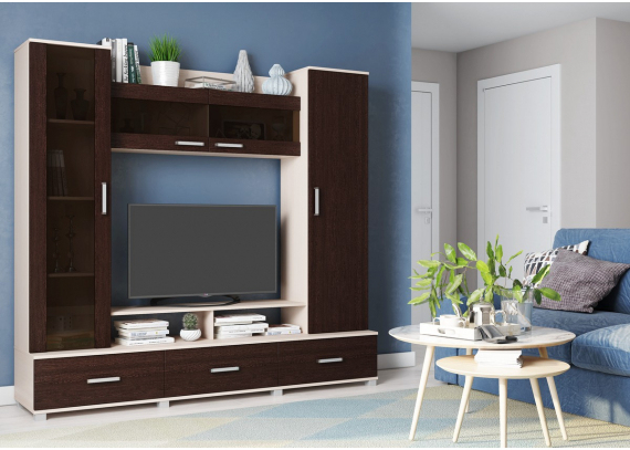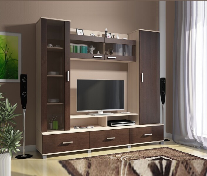 Прекрасная функциональность и строгий дизайн – отличительные признаки гостиной Соло-8. Она хорошо подойдет для оформления небольшой гостиной в темных тонах.