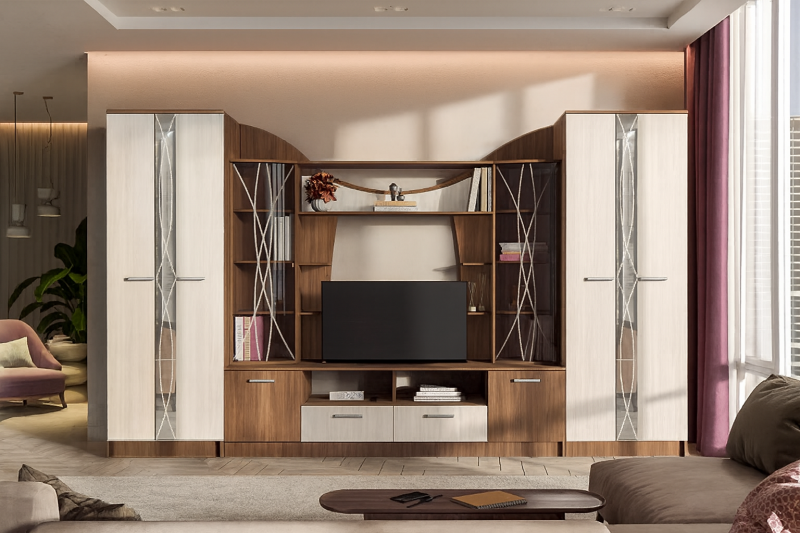 Модульная гостиная «Ольбия» — это элегантное решение для интерьера в классическом стиле. Коллекция выполнена в двух цветовых вариантах, включая изысканное сочетание «Ясень шимо тёмный / Ясень шимо светлый», которое придаёт пространству теплоту, глубину и визуальную гармонию.