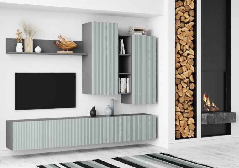 Гостиная Сканди является примером изящного и практичного скандинавского дизайна. В этой стенке удивительным образом сочетается как уют, так и функциональность. Компактный размер стенки и ее многофункциональное наполнение позволяют израсходовать ограниченное пространство комнаты максимально эффективно. Холодный серый оттенок визуально расширяет пространство гостиной и придает ей нотку элегантности. Стенка не имеет ручек, все ее элементы открываются за фасад.