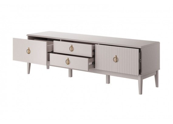 Тумба оснащена четырьмя ящиками на шариковых направляющих полного выдвижения, что обеспечивает удобное и бесшумное открывание и закрывание. Фасады тумбы декорированы фрезеровкой, что придаёт ей стильный и оригинальный вид.