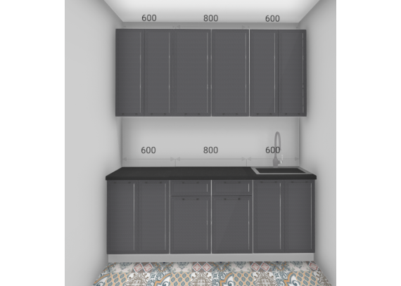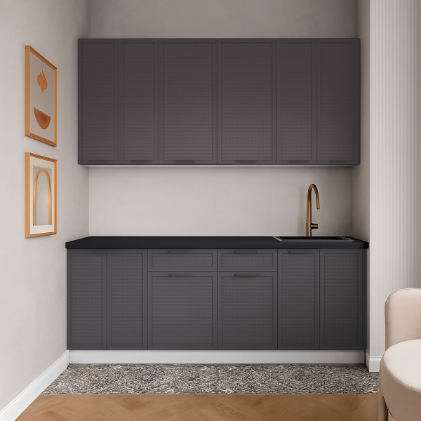 Кухня Индира 2,0м Лофт гранит идеальное сочетание современного стиля и функциональности. Темный корпус и фасад из гранита создают атмосферу строгости и роскоши. Столешница из мрамора Лацио белого цвета добавляет изысканности и элегантности.