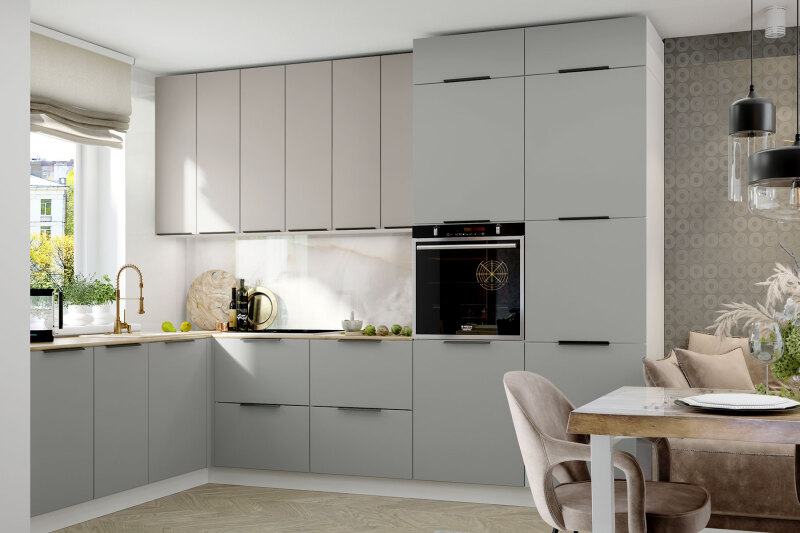 Кухня Калипсо сочетает в себе современный дизайн и высококачественные материалы, обеспечивающие прочность и долговечность конструкции. Корпус кухонного гарнитура изготовлен из ЛДСП 16 мм. Торцевые поверхности корпуса закромлены кромками ПП. Фасады изготовлены из МДФ. Торцевые поверхности фасадов закромлены кромкой ПП и ABS. Задняя стенка модулей кухни выполнена в белом цвете.