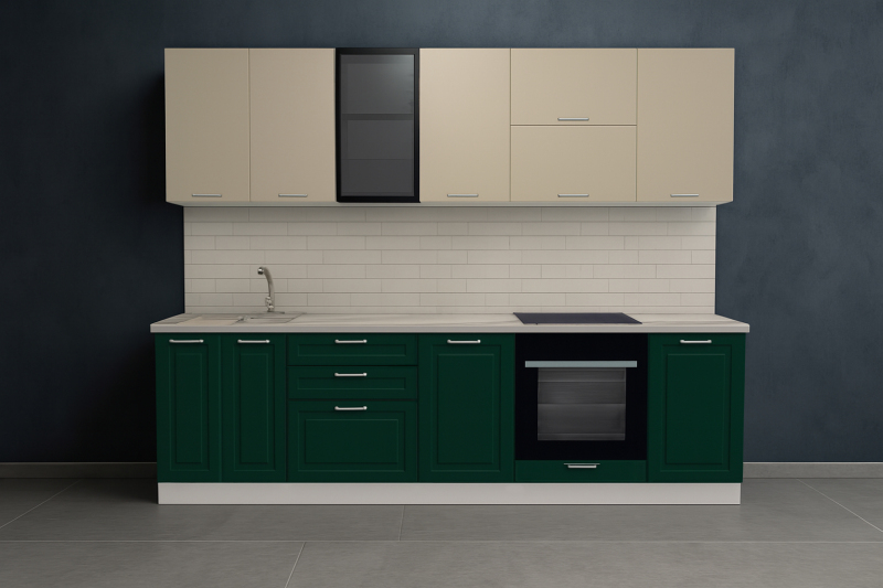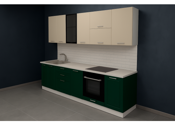 Кухня Калипсо Белый / Зеленый Салерно / Бежевый Бает 2,7 м — это элегантное сочетание зелёных нижних фасадов с фрезеровкой Салерно и бежевых верхних фасадов Бает, дополненное белым корпусом и столешницей Азул толщиной 38 мм. Гарнитур идеально подходит для интерьеров, где важны выразительность, комфорт и премиальные детали.
