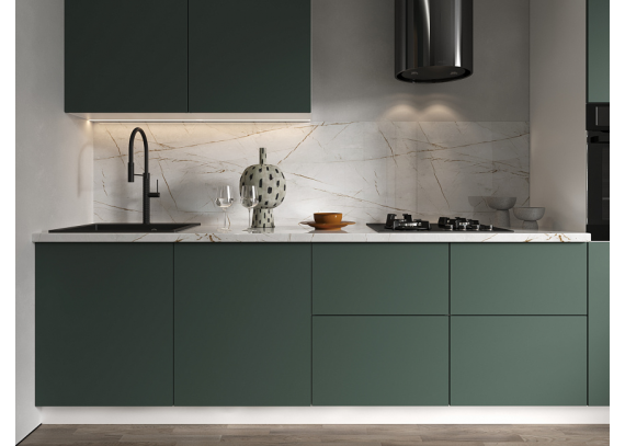 Фасады изготовлены из МДФ и стекла, покрыты пластиком Акрилит с матовой текстурой, устойчивой к загрязнениям и механическим повреждениям. Корпус выполнен из ЛДСП, соответствующего экологическим стандартам Е1. Все модули оснащены доводчиками, а торцевые фасады входят в комплект. Столешница, стеновая панель и ручки приобретаются отдельно, что позволяет гибко настроить кухню под ваш стиль и задачи.