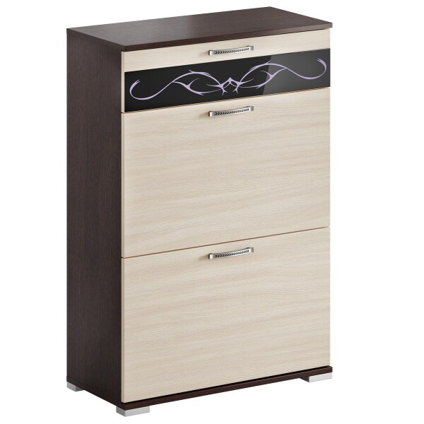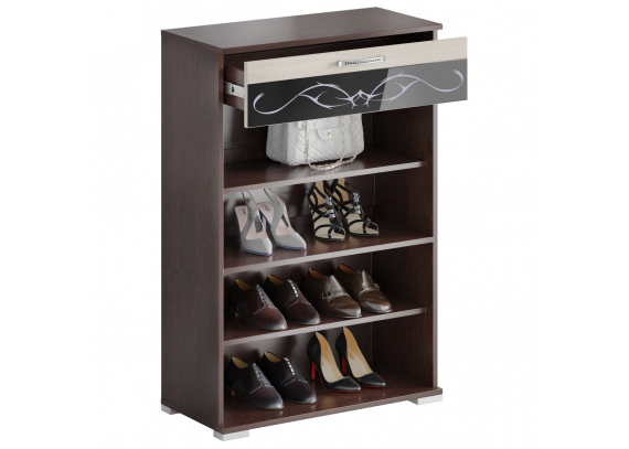 Элегантная и практичная тумба для обуви Юнона 2 великолепно впишется даже в самую узкую прихожую, ведь она обладает компактной глубиной, компенсируемой значительной высотой изделия, которой хватает на размещение двух отделений с полками для обуви на газовых кронштейнах, и дополнительно выдвижным ящиком на шариковых направляющих длиной 300 мм. Такой ящик способен выдержать значительные нагрузки благодаря усовершенствованным направляющим, а также будет открываться бесшумно и до конца. Фасад тумбы украшен изящной черной вставкой и придает пикантности внешнему виду обувницы.