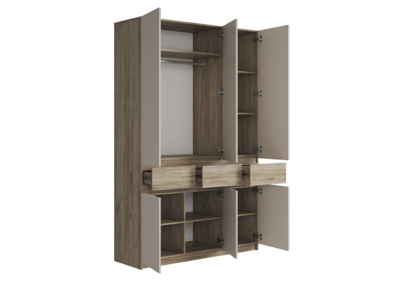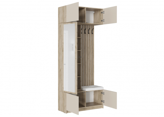 Выполненная в скандинавском стиле прихожая Бостон состоит из навесной антресоли, вместительной напольной тумбы, шкафа-пенала с зеркалом, 3-створчатого шкафа, а также из стильной стенки-вешалки, выполненной из профилей. Гарнитур Бостон - находка для небольших прихожих.