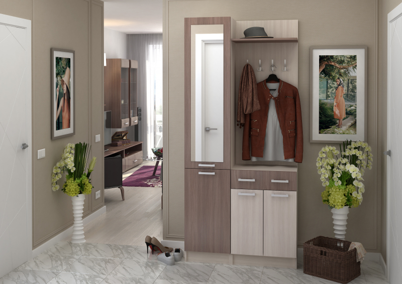 Прихожая Грация-1 не займет много места, но в то же время решит проблему хранения вещей для небольшой семьи. Закрытый одностворчатый шкаф-пенал разделен горизонтально на две части, верхняя – зеркальная – предназначена для верхней одежды, нижняя оборудована полками. Имеется открытая вншалка с крючками и полкой для головных уборов. Под ней расположены выдвижные ящики для перчаток и ключей и двустворчатая тумба для обуви. Сочетание светлого и темного оттенков шимо в отделке прихожей придает ей достойный и благородный вид.