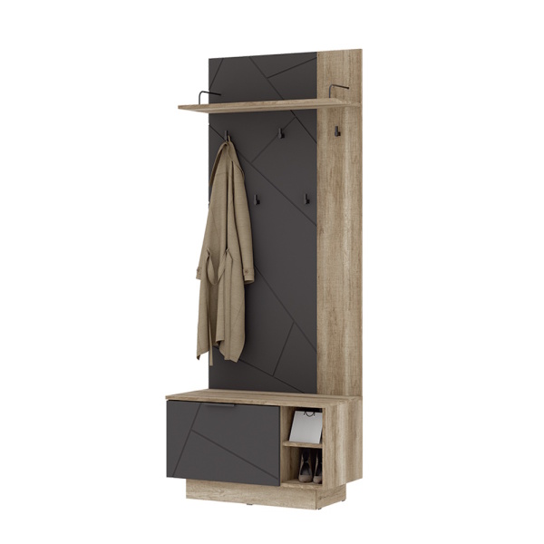 Вешалка Даллас ВШ-01 - классический предмет обстановки прихожей. Она предусматривает все, что необходимо для вашего комфорта: крючки для верхней одежды, закрытое и открытое отделение для обуви, полку для хранения головных уборов. Изделие выполнено из материалов спокойных тонов - МДФ «Софт графит», ЛДСП «Дуб Каньон», фасад обувницы и часть задней стенки вешалки украшены геометрическим рисунком, матовая фурнитура темного цвета дополняет стильный вид модели.