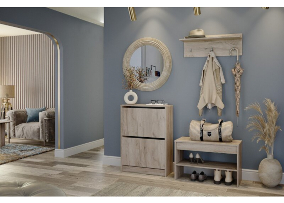 Вешалка настенная Лофт с полкой. Крючки пластиковые в цвете металлик. Вешалка изготовлена из ЛДСП 16 мм. Торцевые детали закромлены кромками ПВХ в цвете дуб крафт серый.