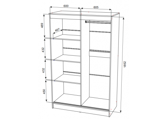 - Функциональные наполнение. Шкаф-купе оснащен штангой и тремя полками, что позволяет аккуратно разместить одежду, аксессуары и другие предметы гардероба.