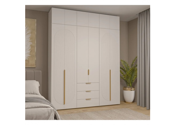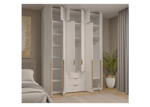 Комбинированная система хранения включает полки, вешала и выдвижные ящики, позволяя удобно организовать гардероб. Благодаря универсальному белому цвету и компактным размерам, модель легко впишется в любой интерьер, от классики до минимализма.
