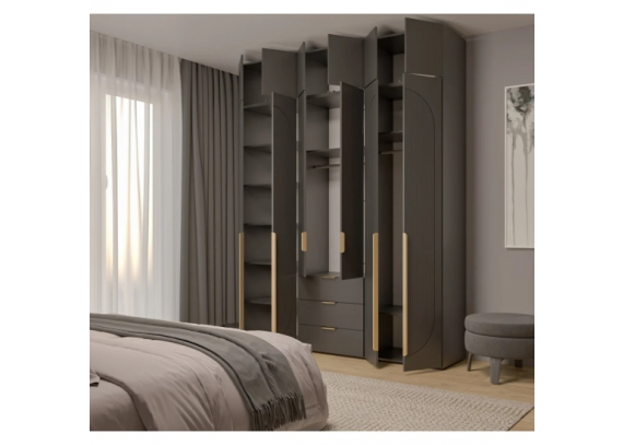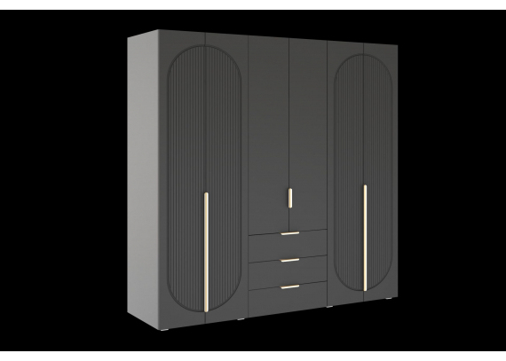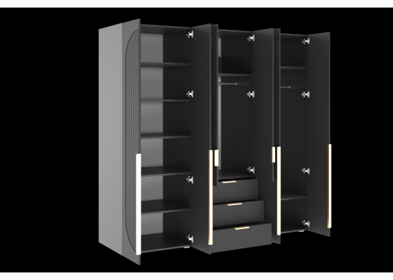 Шкаф оснащён качественной фурнитурой с доводчиками, обеспечивающими плавное и бесшумное открывание дверей и движение ящиков. Внутри предусмотрена комбинированная система хранения — полки, вешалки и ящики на шариковых направляющих, что позволяет удобно организовать гардероб и аксессуары.