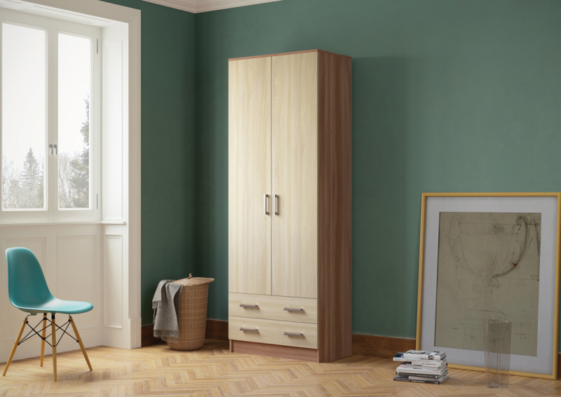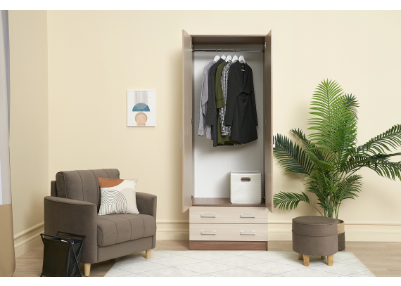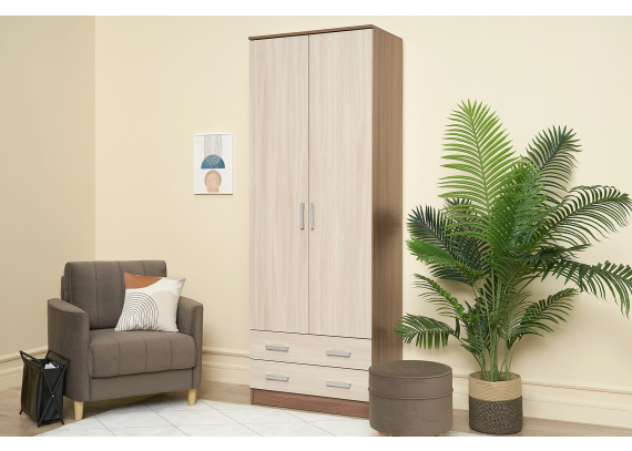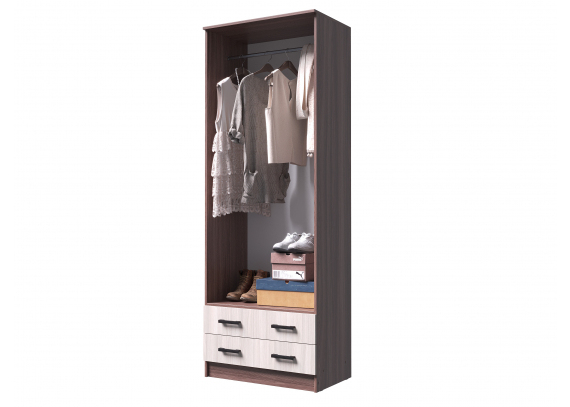 Кроме того, в нижней части шкафа расположены два выдвижных ящика на роликовых направляющих, предоставляющие дополнительное место для хранения белья и других вещей. Шкаф выполнен в комбинированном цвете - сочетание темного корпуса и светлого фасада. Такая цветовая гамма добавляет шкафу изысканности и привлекательности, а также позволяет успешно интегрироваться в различные стили интерьера. Материал шкафа - высококачественный ЛДСП, что гарантирует долговечность и прочность изделия.