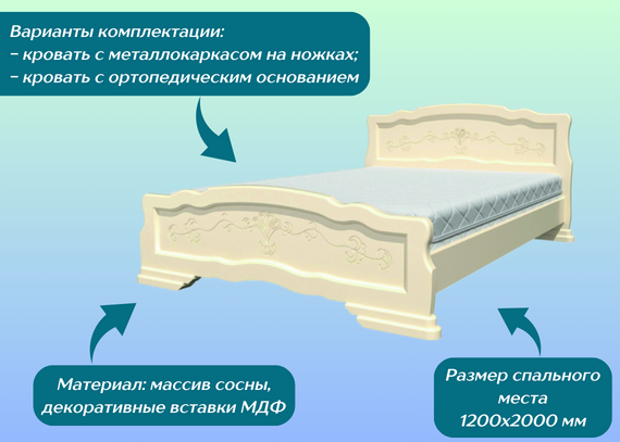 Кровать Карина-6, изготовленная из массива сосны с элементами из МДФ, станет выгодным приобретением для Вашего дома. Комфортная и удобная, она позволит наслаждаться отдыхом в полной мере. Прочный каркас и качественная фурнитура прослужат долгое время, а резьба на обеих спинках кровати Карина-6 значительно освежает внешний вид и придает стильность, что также будет выгодно смотреться в любом интерьере.