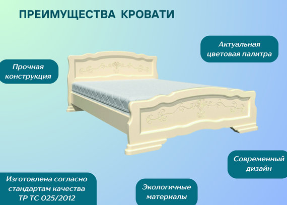 - Изготовлен согласно стандарту ТР ТС 025/2012. Кровать Карина-6 соответствует особым требованиям по безопасности, долговечности и функциональности.