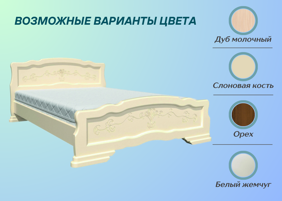 - Актуальная цветовая палитра. Кровать Карина-6 доступна к заказу в 4-х цветах: дуб молочный, орех, белый жемчуг, слоновая кость. Это позволит создать идеальный интерьер, отражающий ваш вкус и предпочтения.