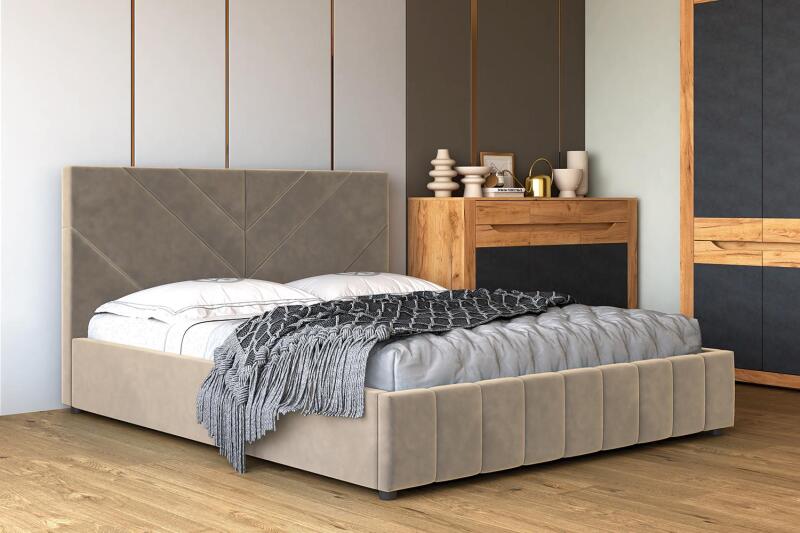 Кровать Нельсон 1,2 м Линия представляет собой компактную двуспальную модель с мягким изголовьем, обшитую тканью Серо-бежевый (вариант 3). Линейная простёжка придаёт кровати строгую геометрию, а универсальный серо-бежевый оттенок велюра создаёт тёплую и сбалансированную атмосферу в интерьере спальни.