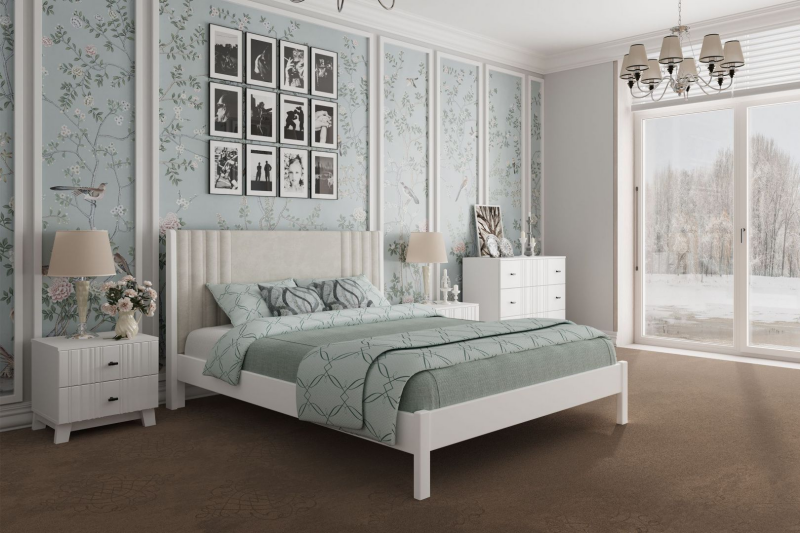 Изголовье украшено мягкой вставкой с декоративной стёжкографией, а царговый пояс выполнен из массива сосны — это надёжность, качество и долговечность. Габаритные размеры: 1944×2107×1080 мм. Рекомендуемая высота матраса — от 200 мм. Высота от пола до царги — 173 мм, высота царги — 160 мм.