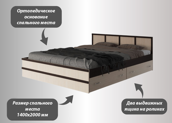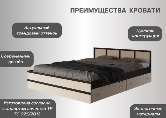Оформление кровати сочетает в себе контрастные оттенки — тёмный венге и светлую соному, создавая динамичный и сбалансированный образ. Для изготовления использованы качественные материалы: ламинированная ДСП и берёзовые ламели. Благодаря стильному дизайну и практичности, кровать Сакура станет достойным элементом любой современной спальни.