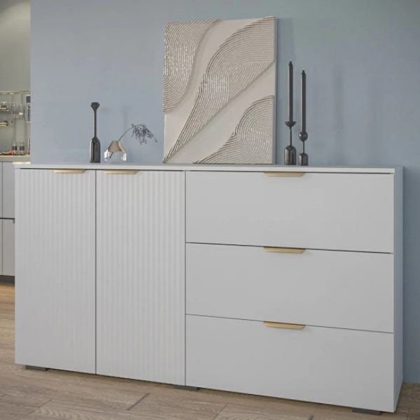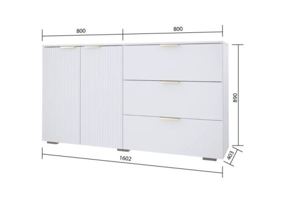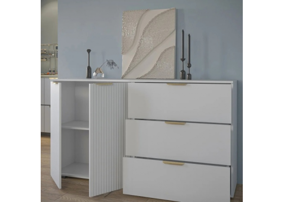 Комод выполнен из ЛДСП, устойчивого к механическим повреждениям, с фасадами из МДФ в отделке Белый Софт. Ящики оснащены шариковыми направляющими, что обеспечивает плавное и бесшумное открывание. Металлические ручки подчёркивают изысканность модели и сохраняют внешний вид даже при активной эксплуатации.