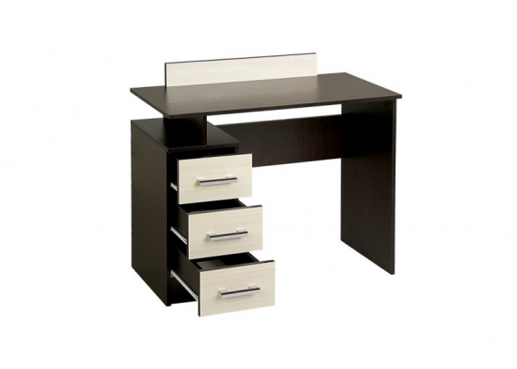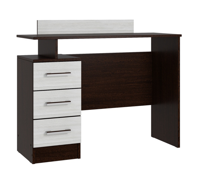 Трюмо Эко — модель с несколькими возможными вариантами применения. Стол оборудован тумбой с 3 выдвижными ящиками. Столешница довольно узкая, что позволяет использовать стол в качестве туалетного, но достаточно длинная, чтобы образовывать рабочее пространство для школьника или студента. Стол изготовлен из ЛДСП.