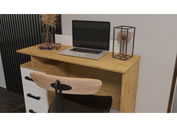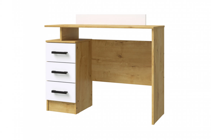 Трюмо Эко — модель с несколькими возможными вариантами применения. Стол оборудован тумбой с 3 выдвижными ящиками. Столешница довольно узкая, что позволяет использовать стол в качестве туалетного, но достаточно длинная, чтобы образовывать рабочее пространство для школьника или студента. Стол изготовлен из ЛДСП.